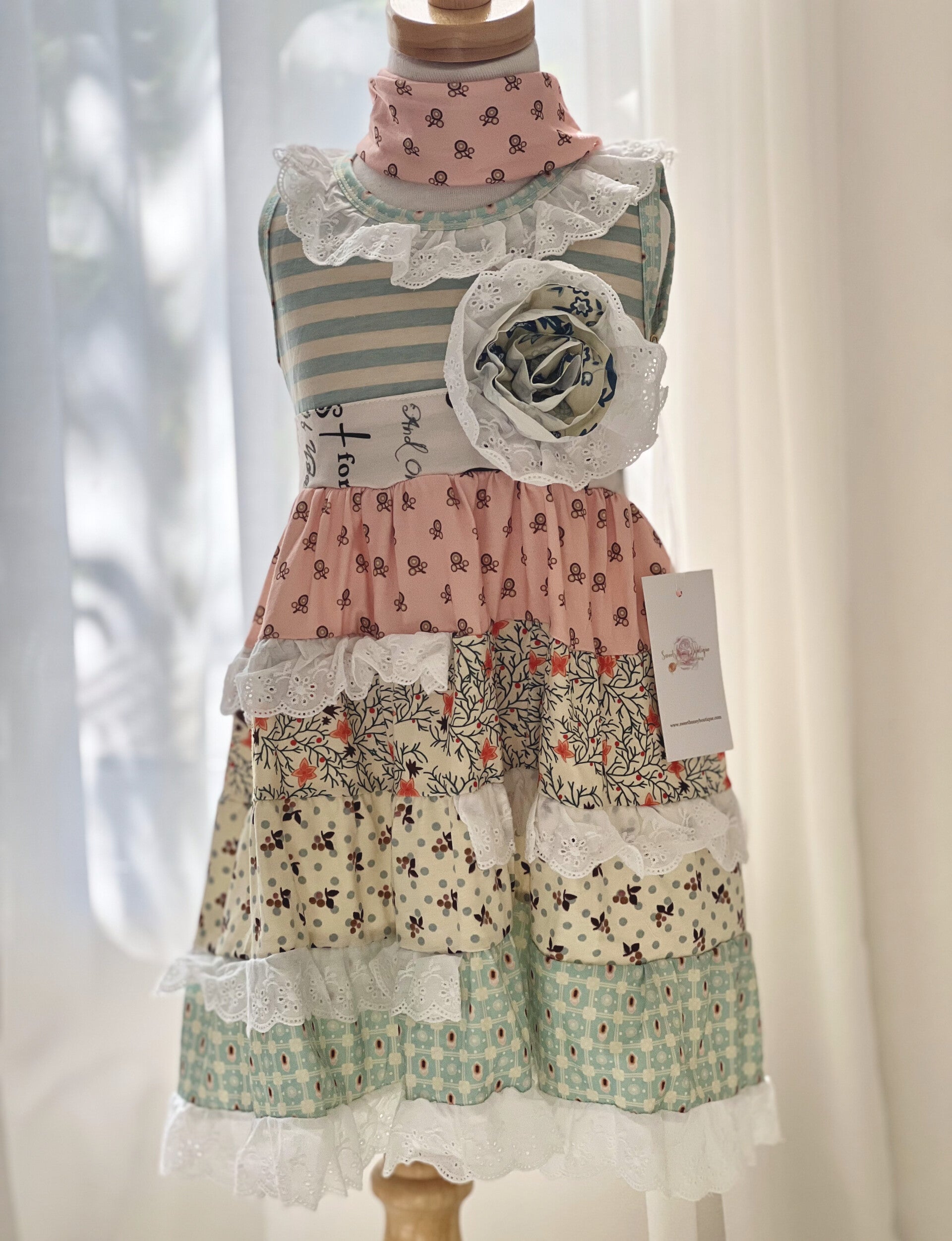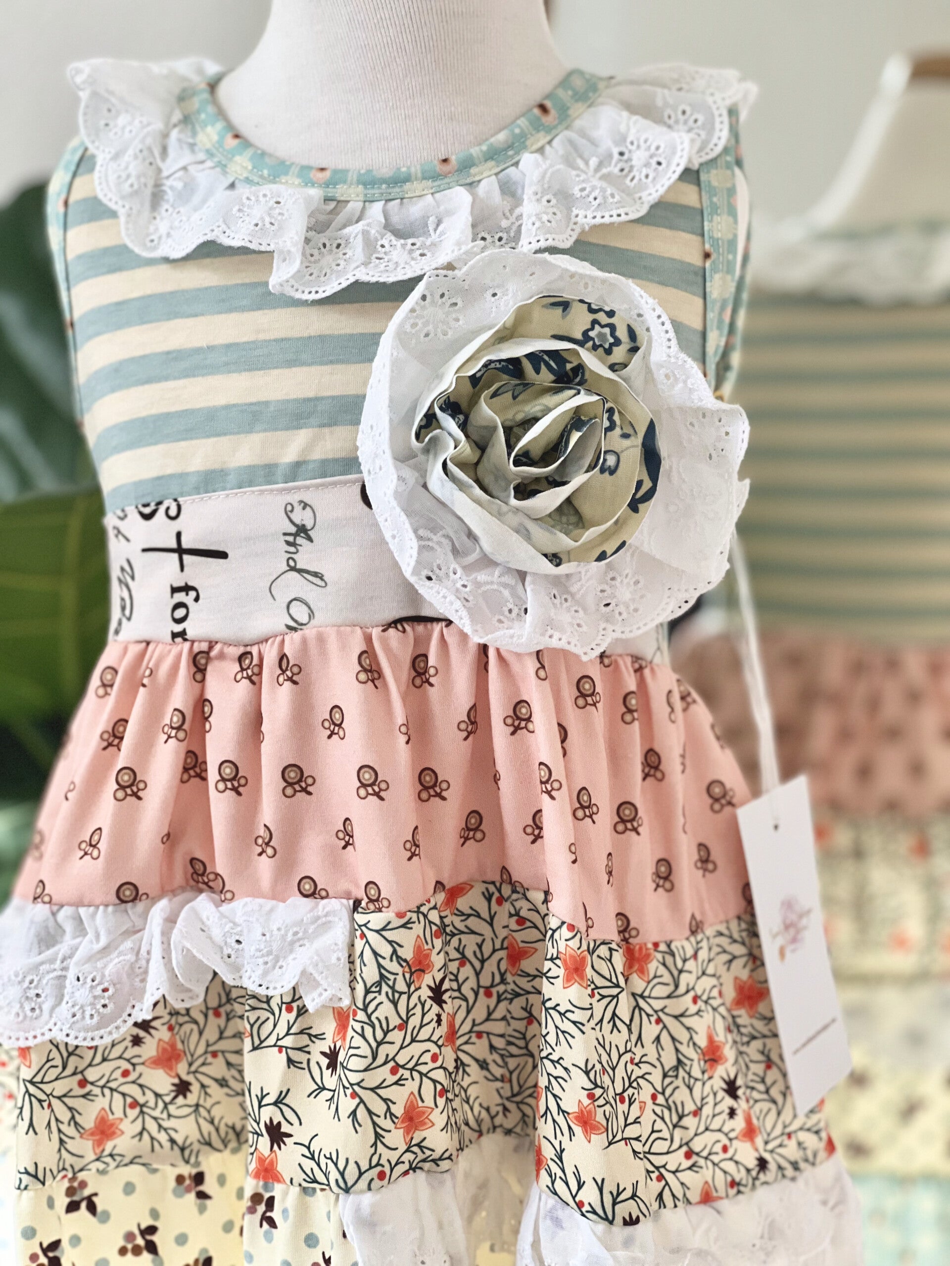 The Heirloom Garden Dress is sweet and adorable! Designed in a vintage style, it features a lovely flower at the front of the dress, soft patterns, lace ruffles, and a headband. Perfect for twirls, picking flowers, or any day you have in store.