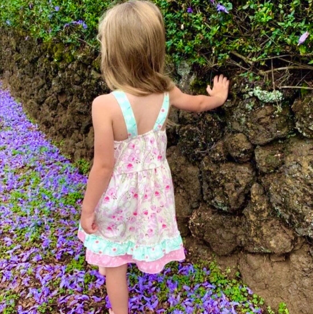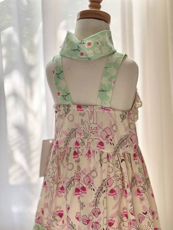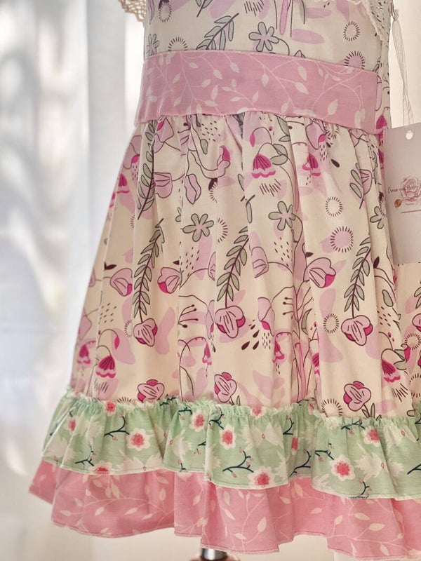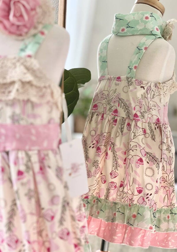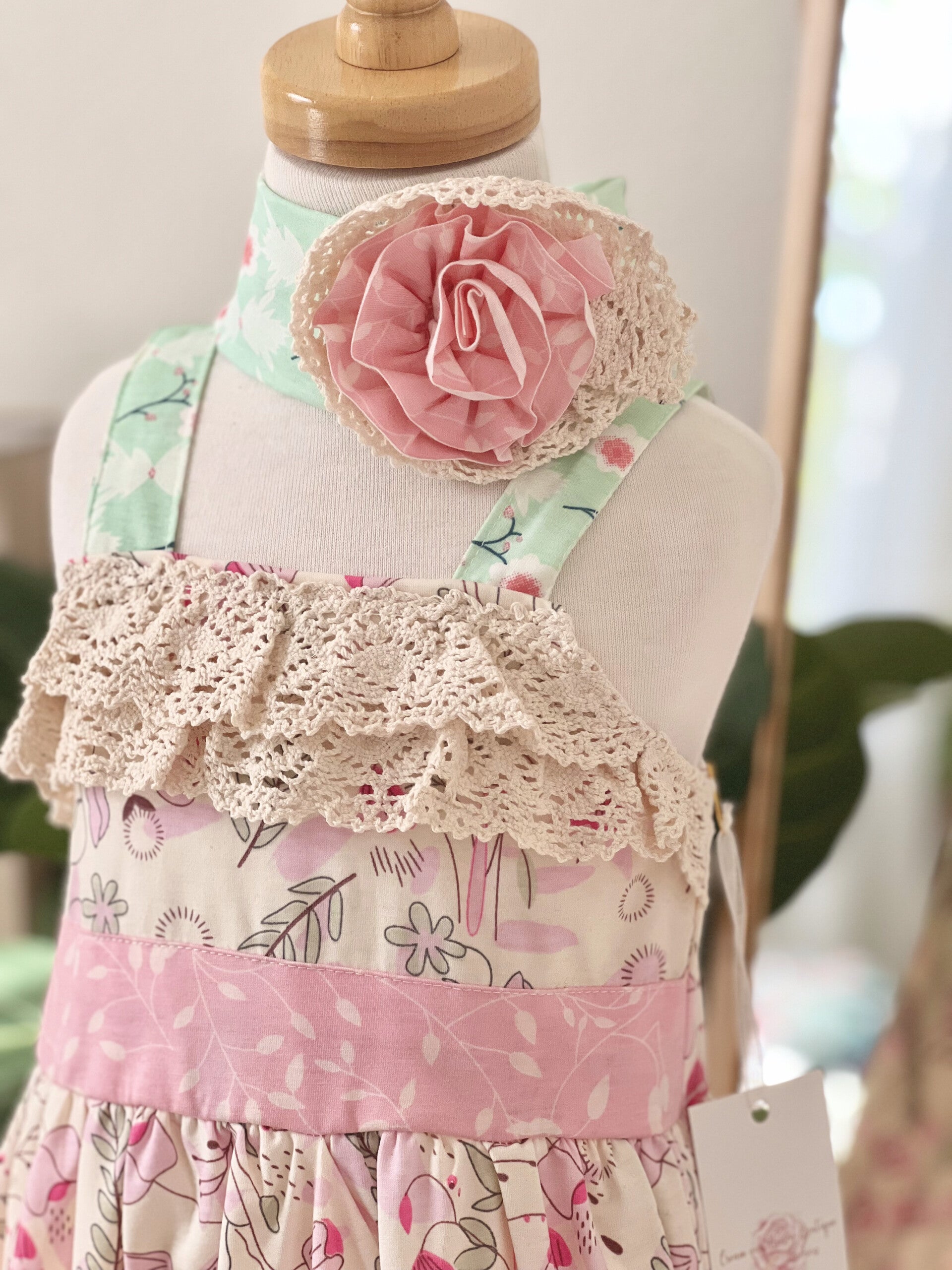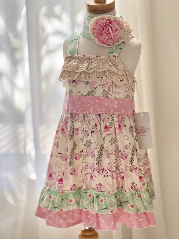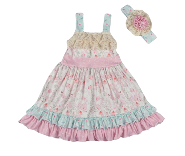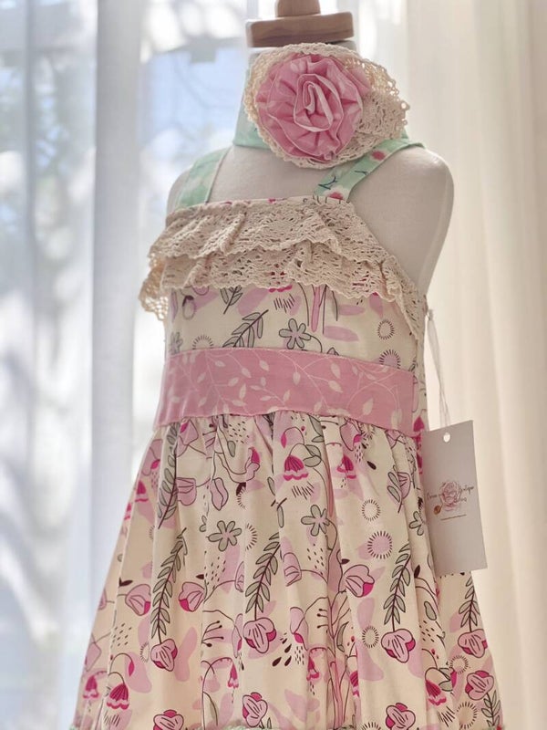The Vintage Garden Dress is sweet and lovely, perfect for spring and summer days filled with sunshine. It features a vintage style cut with floral patterns, delicate lace trim, ruffles, and an adorable headband.