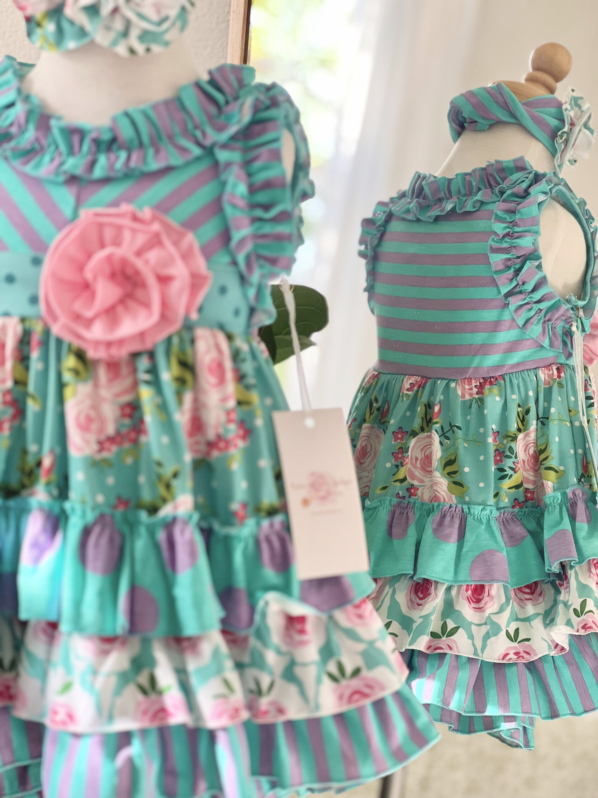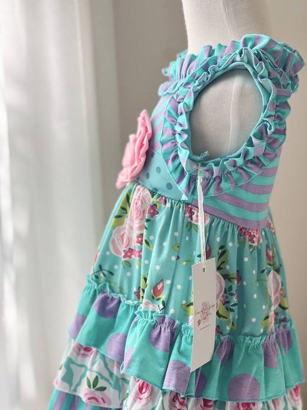 The fragrant scent of fresh sweet basil will remind you of wonderful days spent in the garden with your little girl. This adorable dress and shorts set with matching hair accessory, will be perfect for those moments. It features a flower at the front, floral patterns, and ruffles.