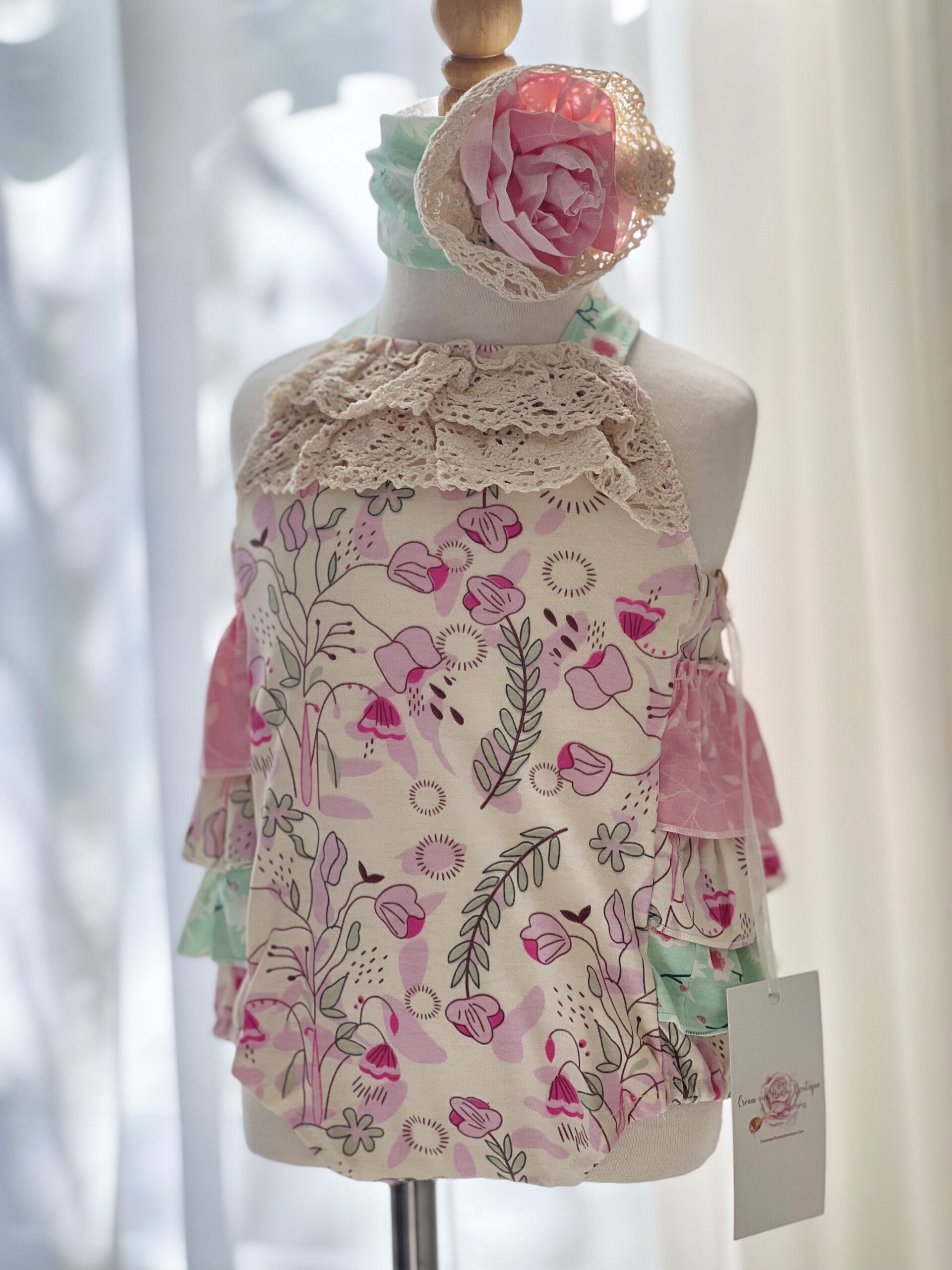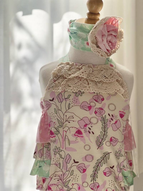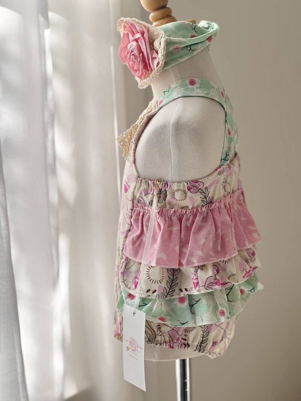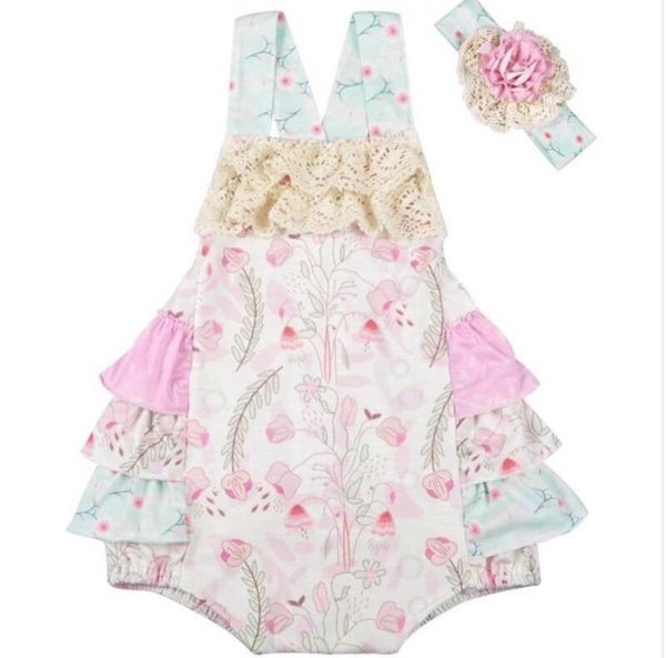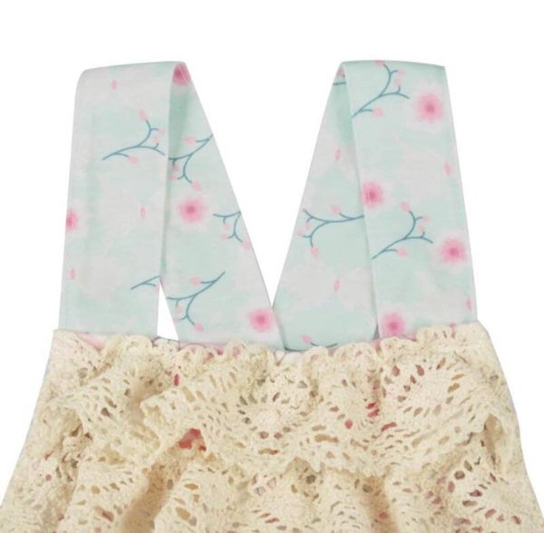 The Sweet Primrose Romper will have your baby looking so darling. This vintage style romper features florals, lace trim, ruffles, and a criss cross back strap. Perfectly pink and dainty, she will be the cutest baby around!