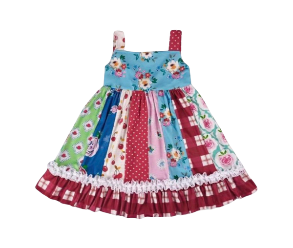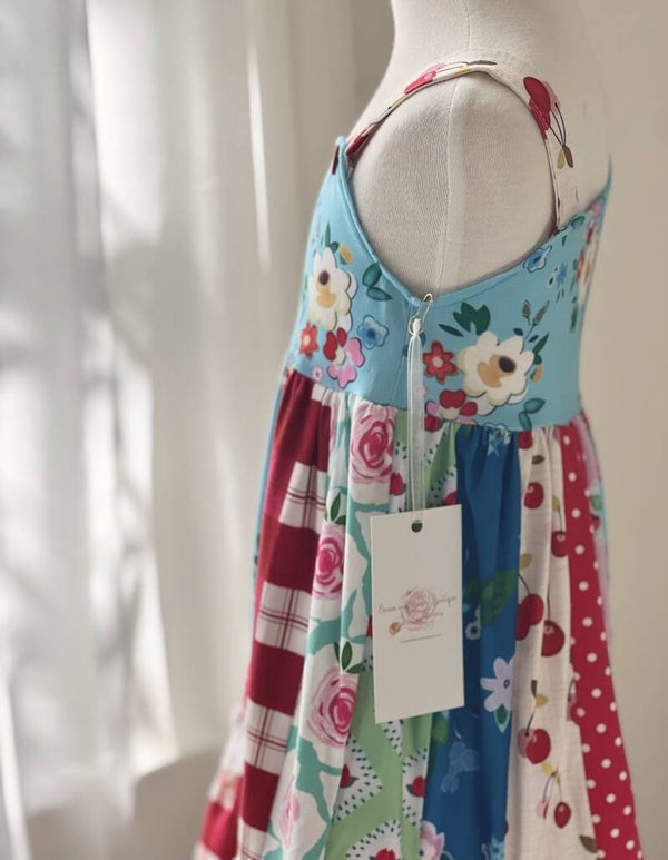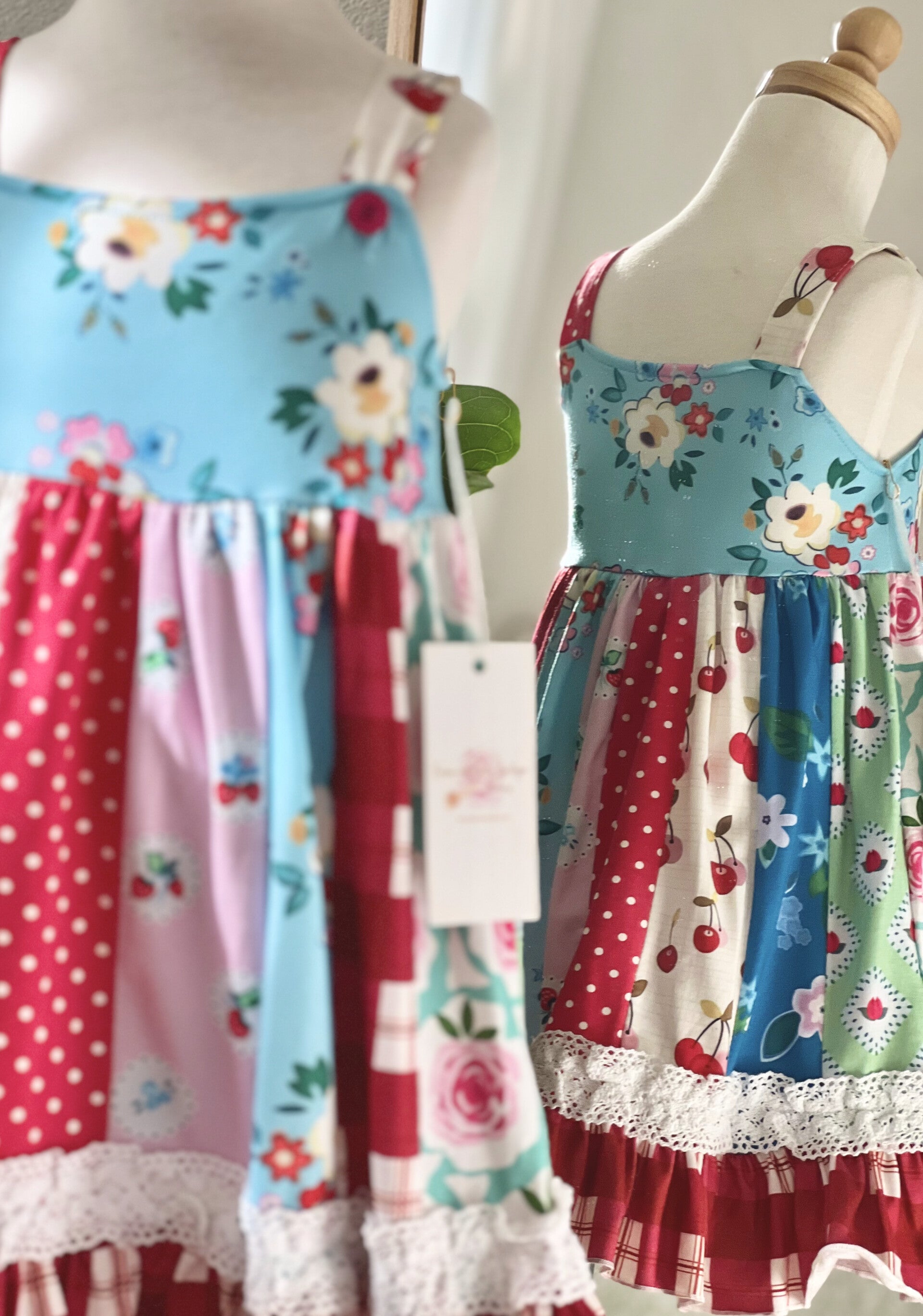The Cherry Blossom Dress is delightful for an outdoor adventure in the garden or park. Designed in a vintage style with garden fruits and vibrant patterns, it features a flowy A-line cut, lace and ruffle trim, decorative buttons and wide straps.