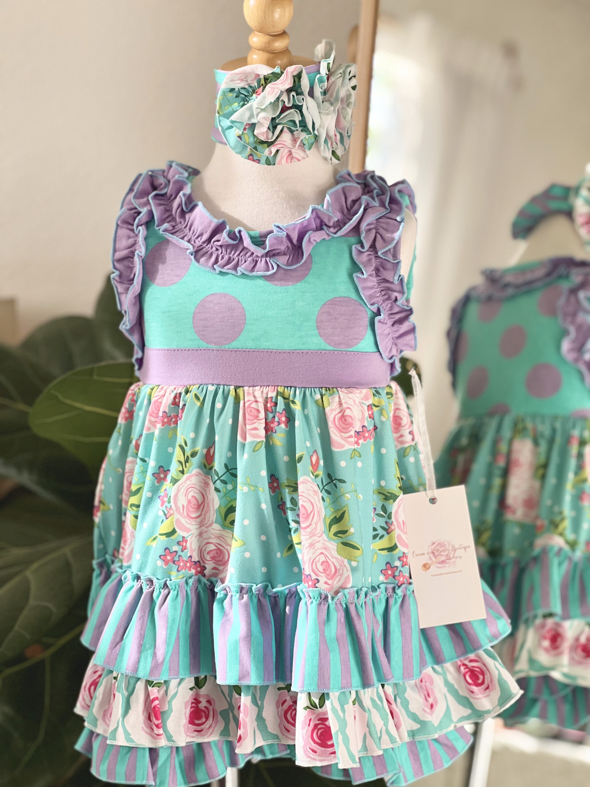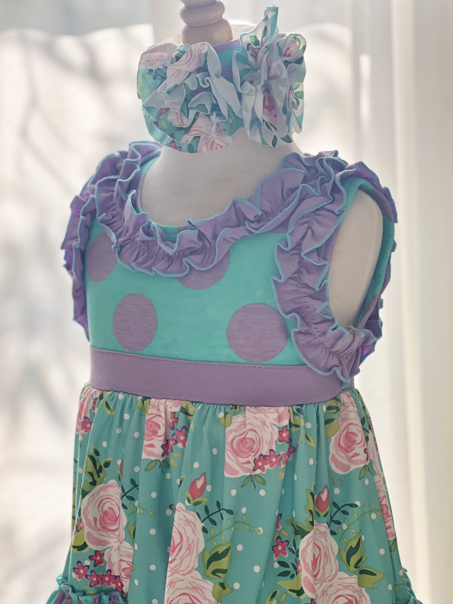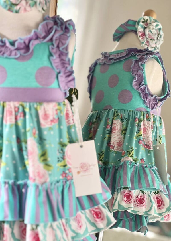 The Lavender Garden Dress is a beautiful, ruffly, patchwork dress, perfect for any hot summer day. Your little girl will look and feel lovely in this cute dress with matching ruffle shorts and hairband set. It features floral and colorful patterns, and whimsical ruffles.