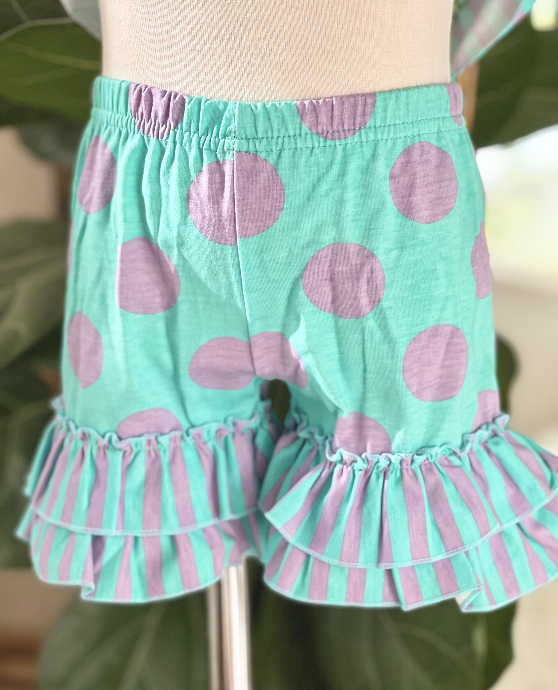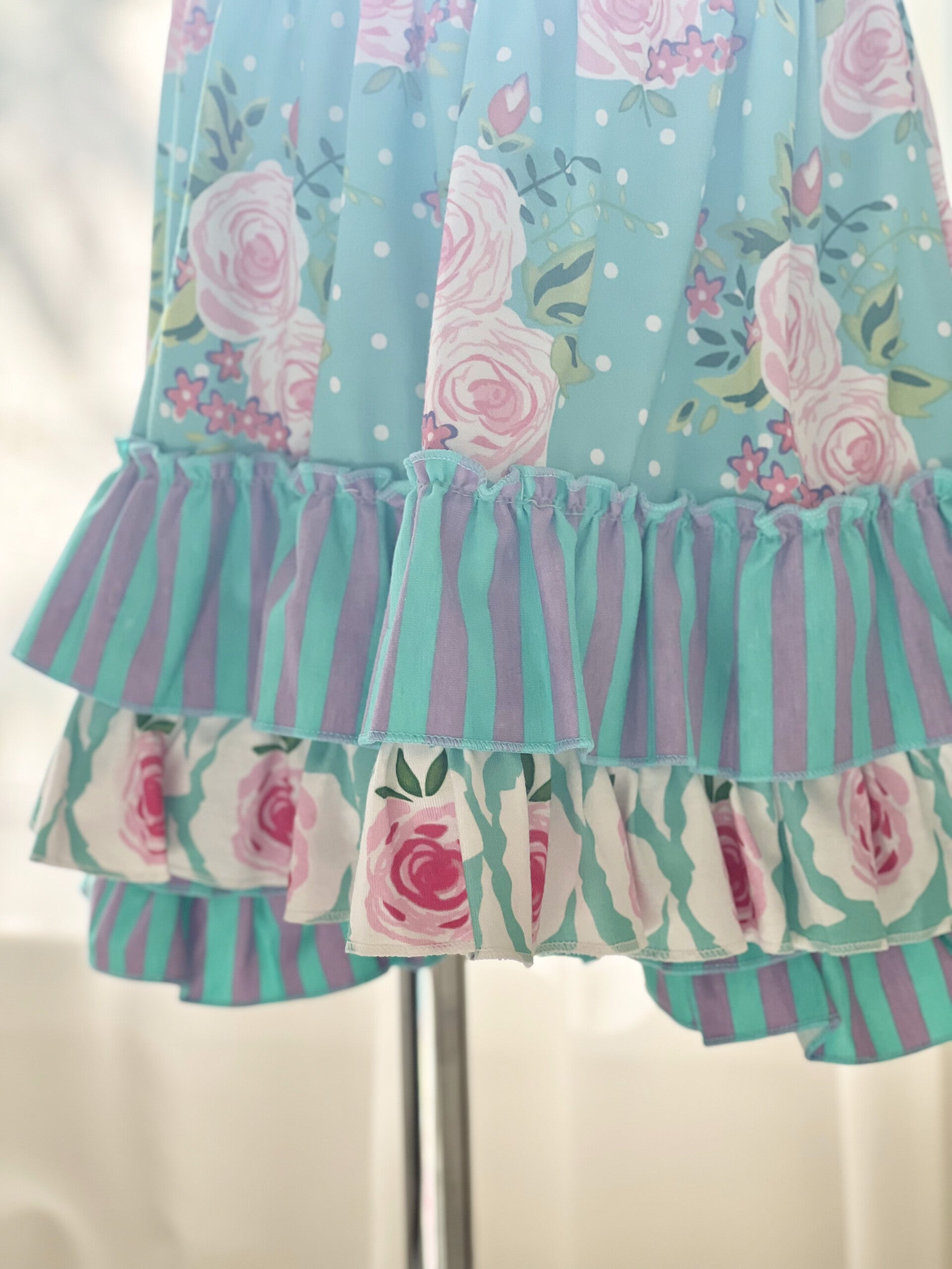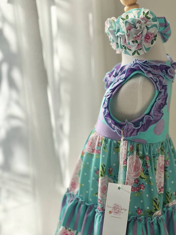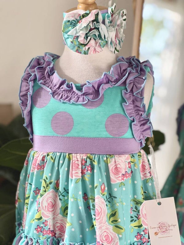 The Lavender Garden Dress is a beautiful, ruffly, patchwork dress, perfect for any hot summer day. Your little girl will look and feel lovely in this cute dress with matching ruffle shorts and hairband set. It features floral and colorful patterns, and whimsical ruffles.